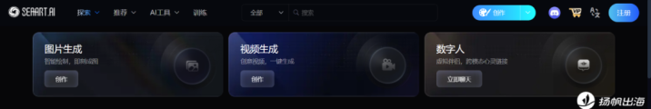 以SeaArt.AI Web端为例,其直观地呈现了图像生成、视频生成、数字人聊天三个主要入口。