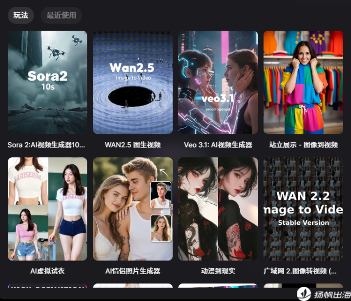 在输入框的“玩法”入口中,用户可以看到最新的Sora 2、Veo3.1多种模型,以及AI情侣照片、吉卜力滤镜、迪士尼滤镜等各式潮流玩法,整体选择的范围很“全面”。